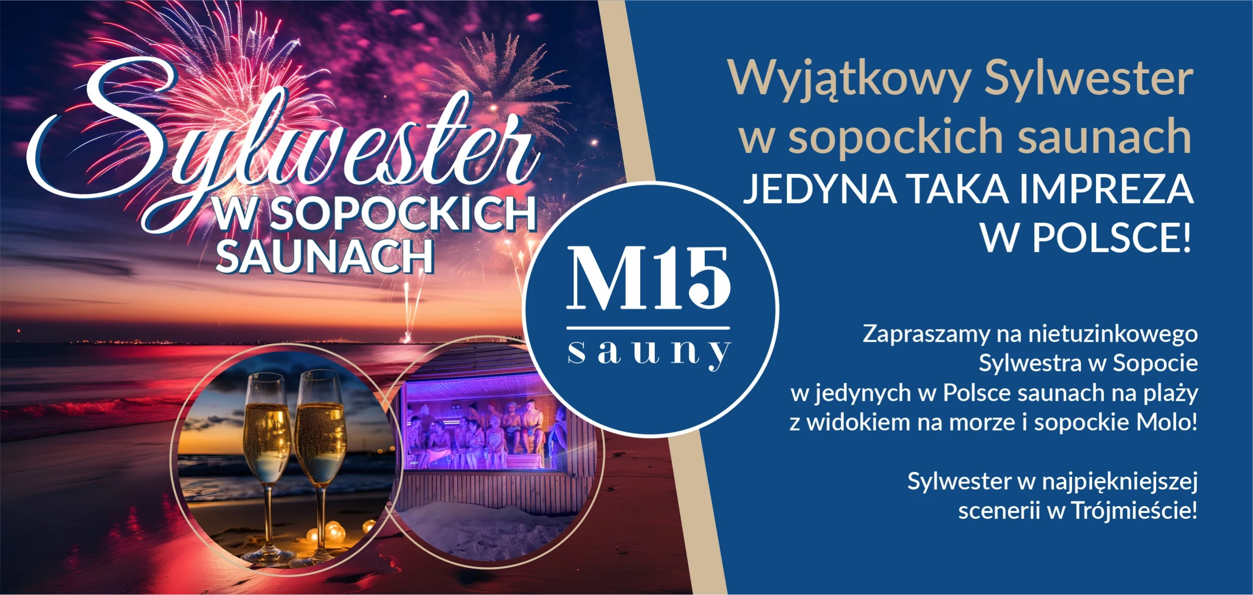 Wyjątkowy Sylwester w sopockich saunach M15 – jedyne w Polsce sauny na plaży z widokiem na morze i sopockie molo. Noc saunowa, morsowanie i świetne jedzenie w najpiękniejszej scenerii w Trójmieście.
